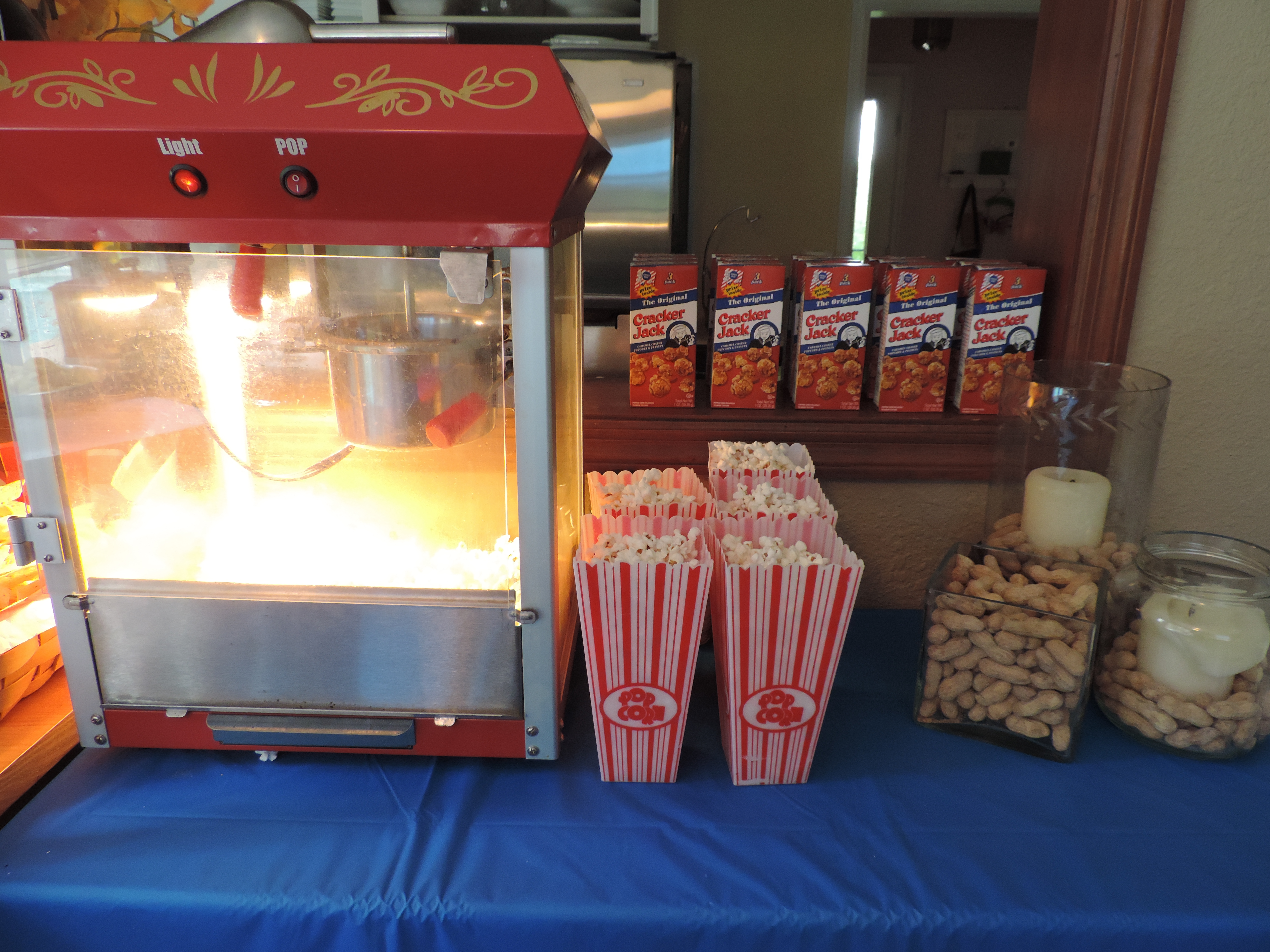 For the food I went as traditional baseball themed as possible. The breakfast nook was transformed into a concession stand. I had a table of peanuts, popcorn and Cracker Jacks. For some added ambiance, I partially filled a couple jars with peanuts and placed a candle in the middle.